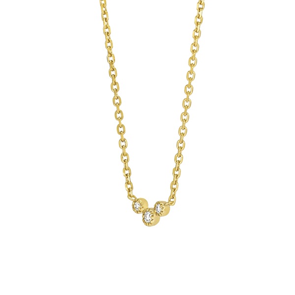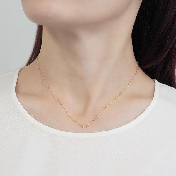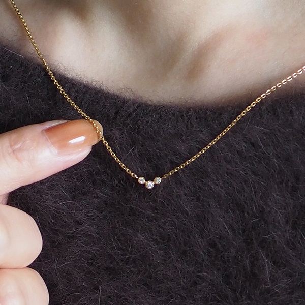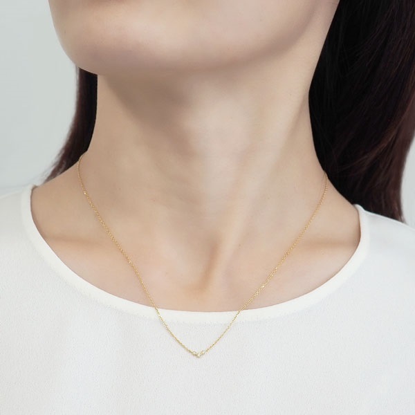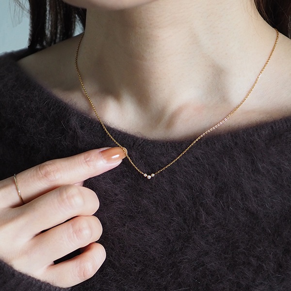 3石のダイヤモンドをV字ラインにセッティングしたネックレス。 両サイドのダイヤモンドをやや高めに配置することで、デコルテのラインをすっきりと美しく見せてくれます。 カジュアルなTシャツやニットにも合わせやすく、上品なコーディネートにもほどよく馴染むデザインです。 シンプルなデザインのネックレスは日常使いしやすく、ギフトにもおすすめです。 ※オンラインショップ限定ジュエリーです。