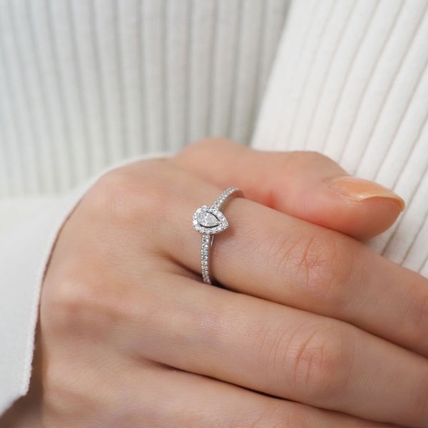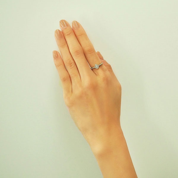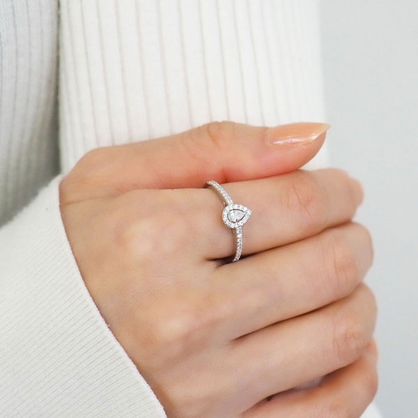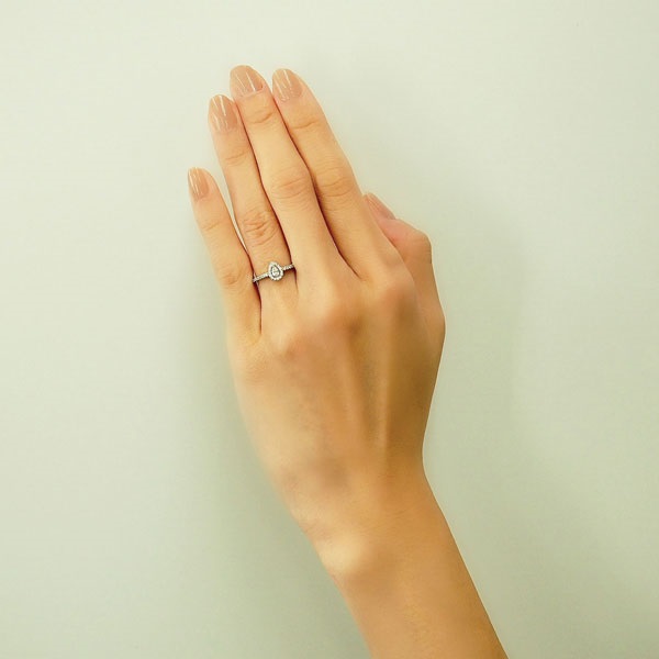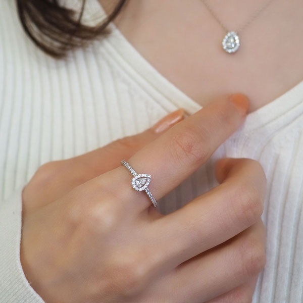 シャープな美しさが魅力のペアシェイプカットのダイヤモンドをセンターに配し、メレダイヤモンドで取り巻いた高級感溢れるリング。