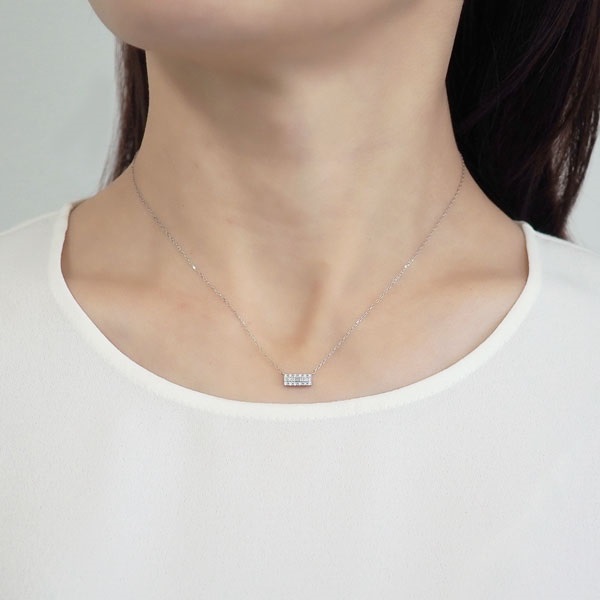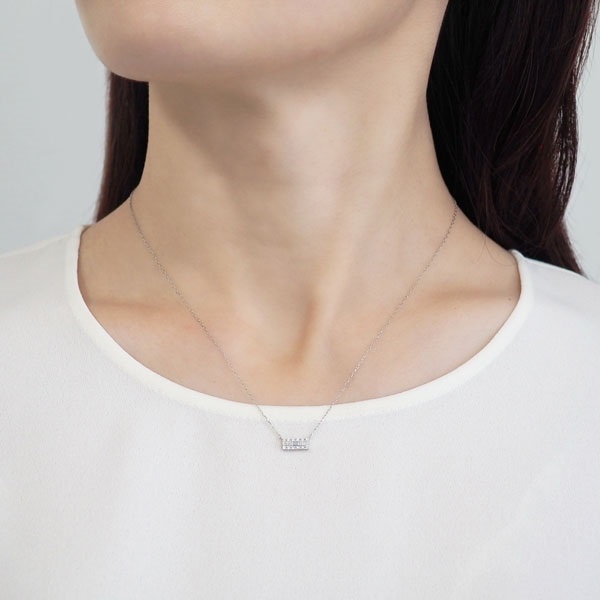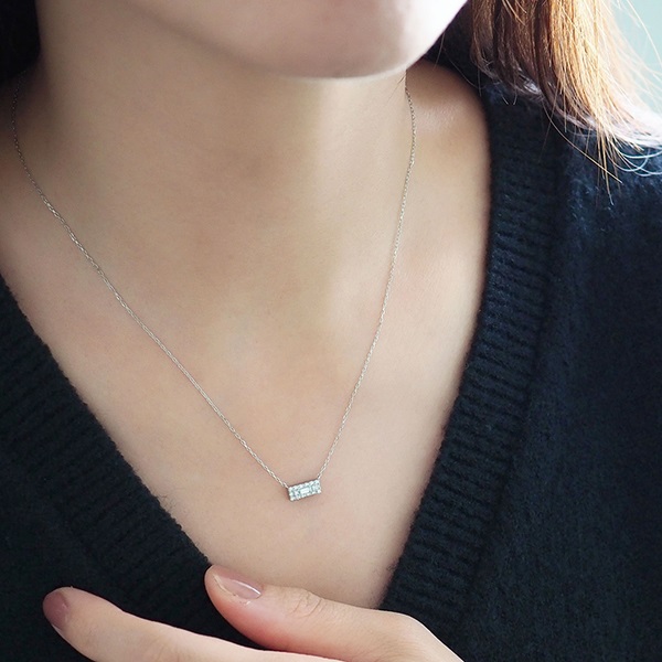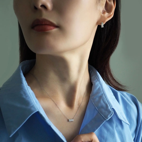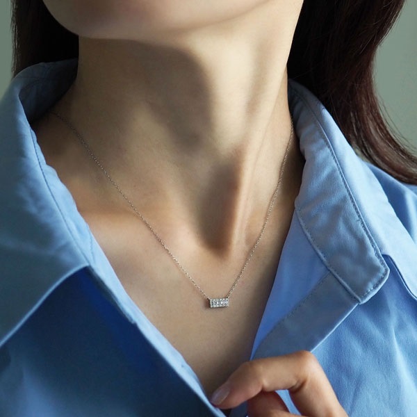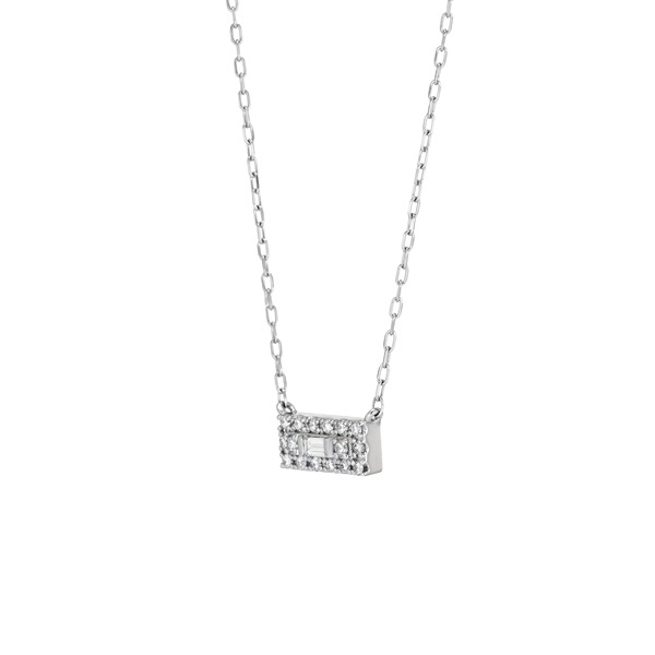 バゲットカットのダイヤモンドをメレダイヤモンドで取り巻いたプラチナのネックレス。すっきりとした長方形のシルエットがスタイリッシュな印象で、デコルテラインに上品な輝きを添えます。 カジュアルな服装だけでなく、ジャケットなどのフォーマルな装いにもぴったり。 永く使えるシンプルなプラチナジュエリーは、大切な方へのプレゼントにもおすすめです。同シリーズでピアスもございます。 セットアップでご着用いただくことも可能です。※2026年3月31日までの期間限定スペシャルジュエリーです。